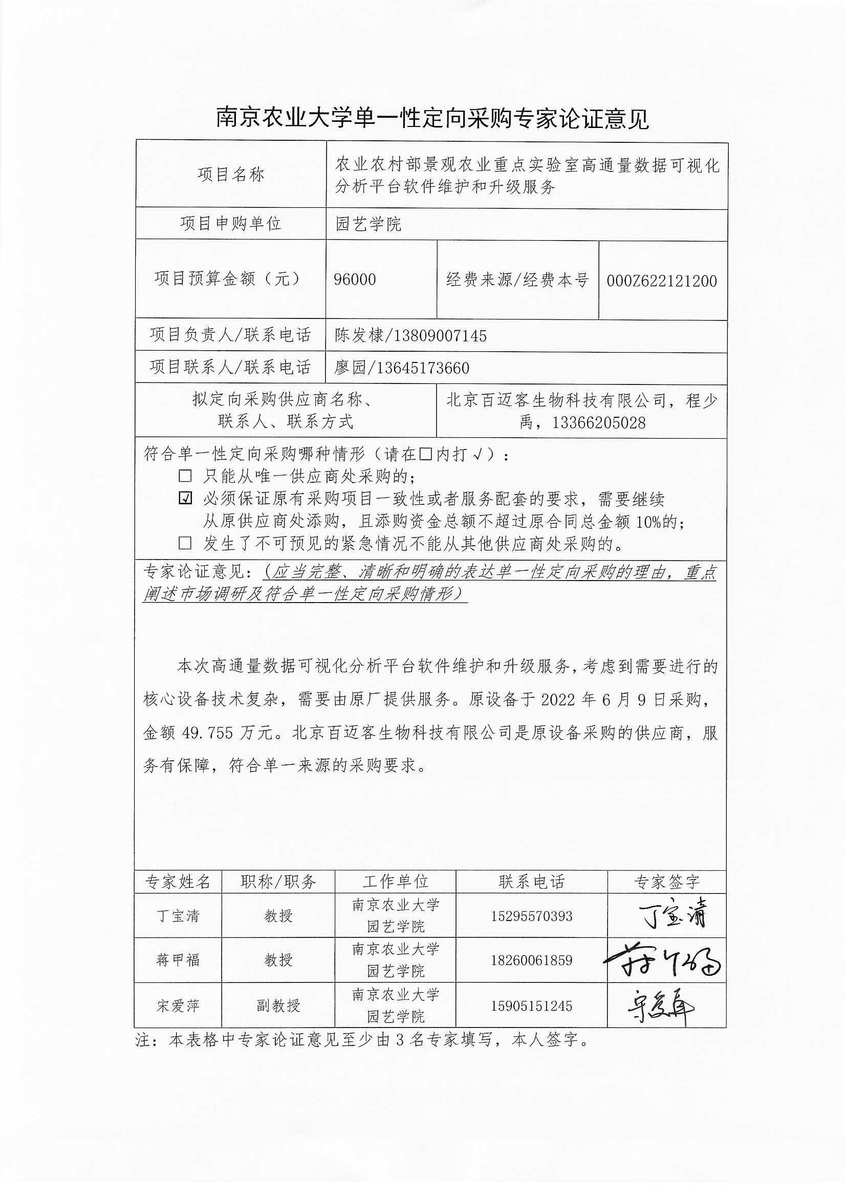 本次高通量数据可视化分析平台软件维护和升级服务,考虑到需要进行的核心设备技术复杂,需要由原厂提供服务。原设备于 2022年6月9日采购,金额 49.755 万元。北京百迈客生物科技有限公司是原设备采购的供应商,服务有保障。